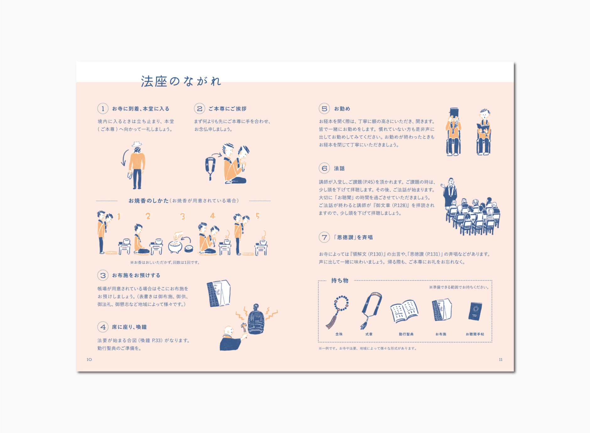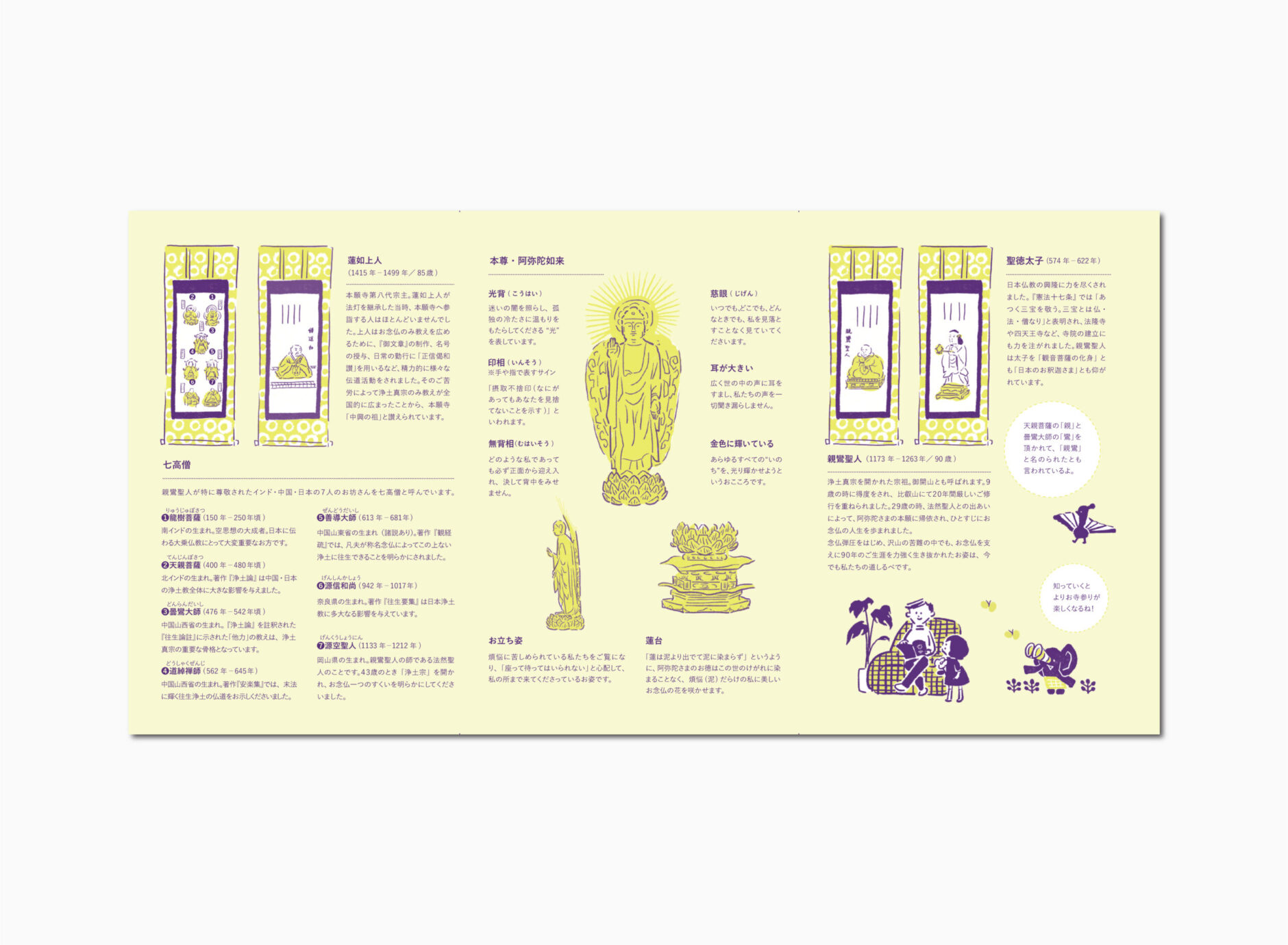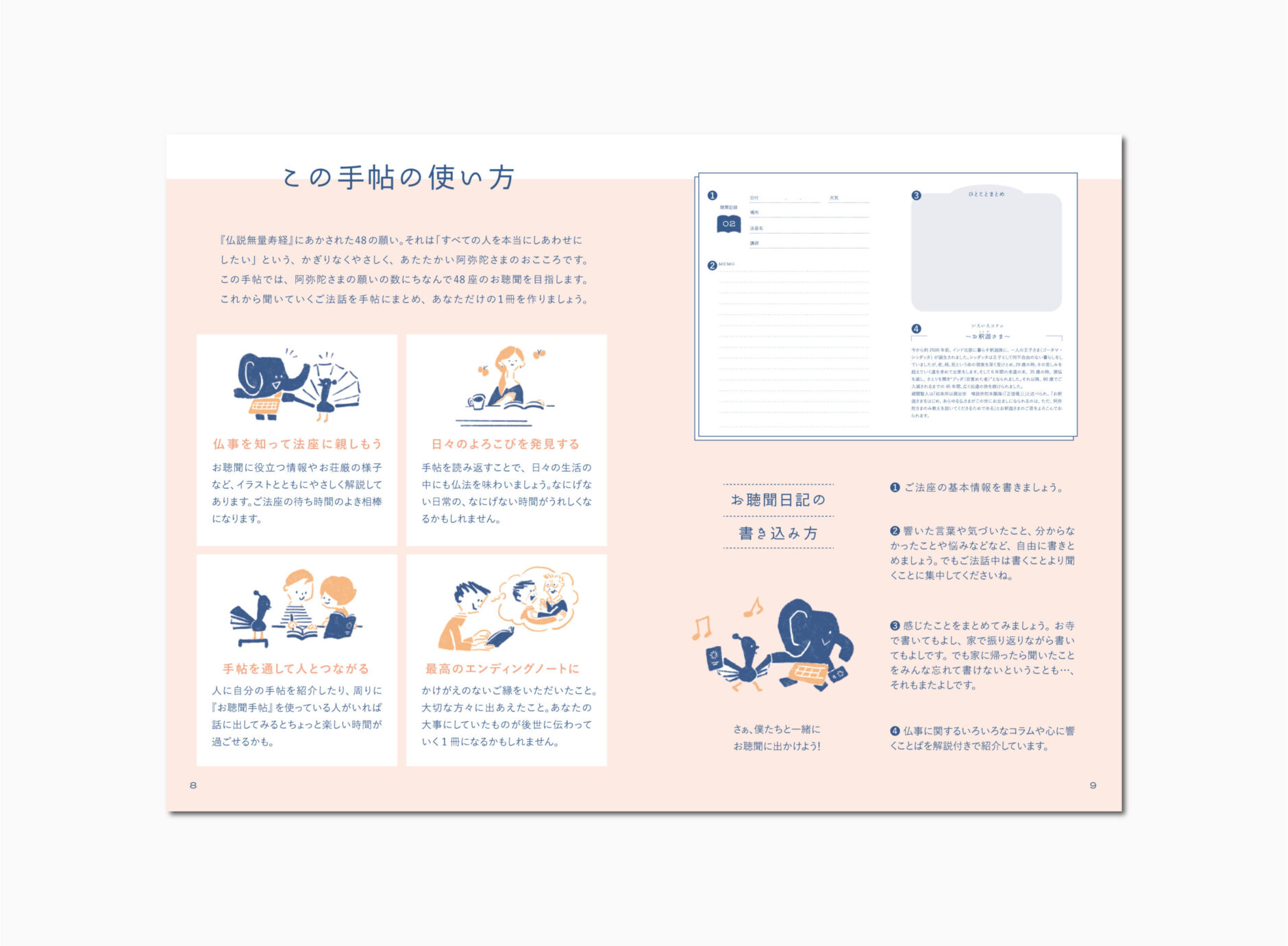 本手帖は、聴聞の手引きとなることを目的に、仏教に関心のない方や、興味はあるもののあと一歩踏み出せない方など、はじめて聴聞の世界に触れる方にも分かりやすく、楽しく学べる内容にしています。